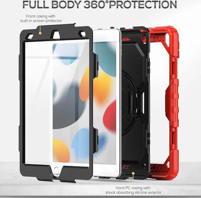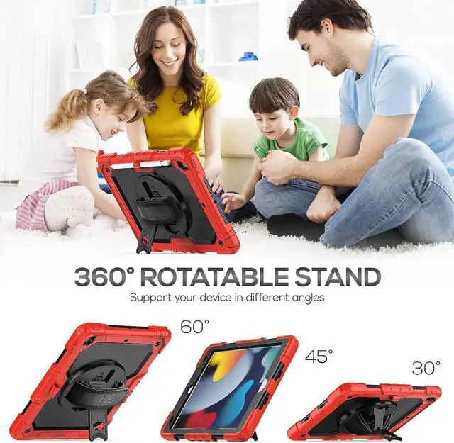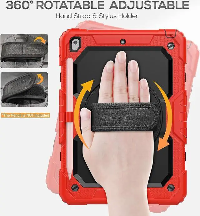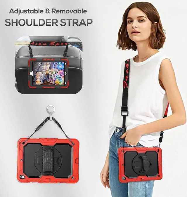iPad 9th/ 8th/ 7th Generation Case 10.2" 2021/2020/2019, Full-Body Shockproof Heavy Duty Protective Case with Screen Protector, 360° Rotating Stand/Handle/Shoulder Strap for iPad 10.2, Red