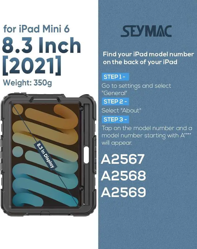 Compatible Model This iPad case is designed to fit 8.3 Inch Pad Mini 6th generation 2021 release (Model: A2567, A2568, A2569). Please kindly check the model number on the back of your iPad (''Axxxx'') before purchase.