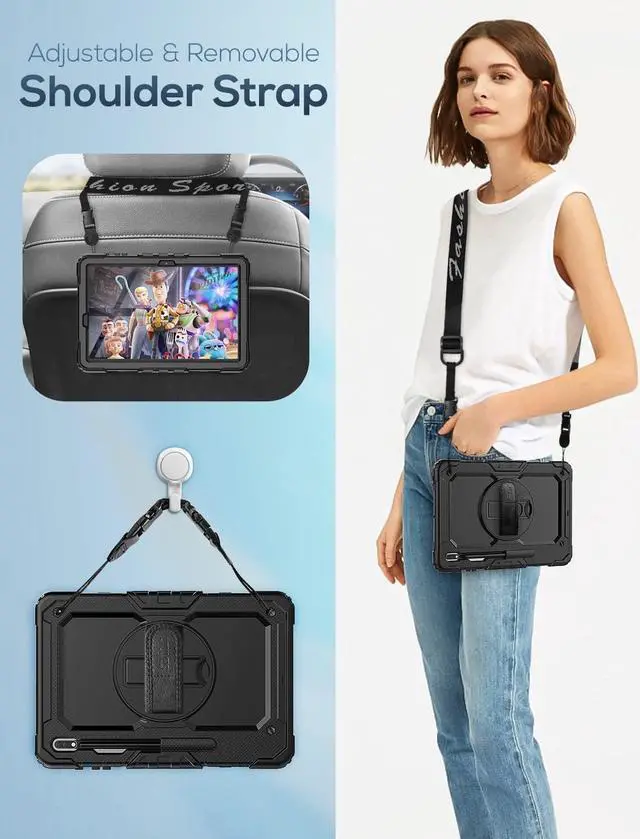 EASY-TO-USE HAND & SHOULDER STRAP- With the adjustable handle on the back, you can hold your tablet securely with single hand, and let your other hand free do other things. The adjustable and removable shoulder strap is kids-friendly for carrying the device, it also could hang on the headrest of car seat or wherever you want.