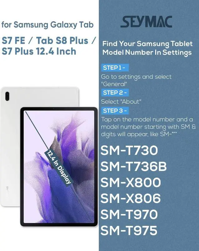 COMPATIBILITY- ONLY Fit for 12.4 Inch Samsung Galaxy Tab S7 FE 2021 (Model: SM-T730/T733/T736/T738), Tab S8 Plus 2022 (Model: SM-X800/X806), and Galaxy Tab S7 Plus 2020 (Model: SM-T970/T975/T976/T978). Please confirm the model before purchase.