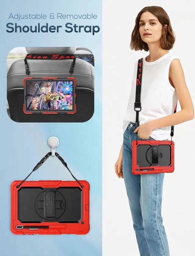 EASY-TO-USE HAND & SHOULDER STRAP- With the adjustable handle on the back, you can hold your tablet securely with single hand, and let your other hand free do other things. The adjustable and removable shoulder strap is kids-friendly for carrying the device, it also could hang on the headrest of car seat or wherever you want.