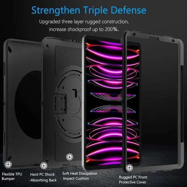 ENHANCED FULL-BODY PROTECTION &10-SHOCK: iPad 12.9 Pro Case exceed 2X Military Grade Drop Test Standard [MIL-STD 810G-516.6], Triple full-body heavy-duty protection provides up to 15ft drop protection, made of 2 durable PC and 1 flexible TPU bumper lasts 10× shock-resistant. Upgrade built-in sponge technology adds extra heat-dissipation.