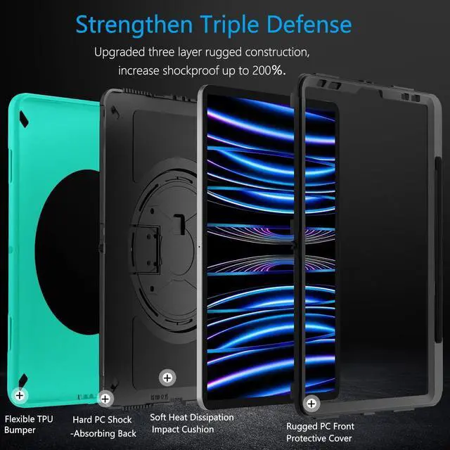 ENHANCED PROTECTION &10-SHOCK: iPad Pro 11 Inch Case Certified [MIL-STD 810G-516.6] protection with 15ft drop tested. All-new built-in sponge technology adds extra heat-dissipation. Upgrade triple construction rugged defense armor protection cover is made of durable PC back and soft flexible TPU bumper lasts 10× shock-resistant.