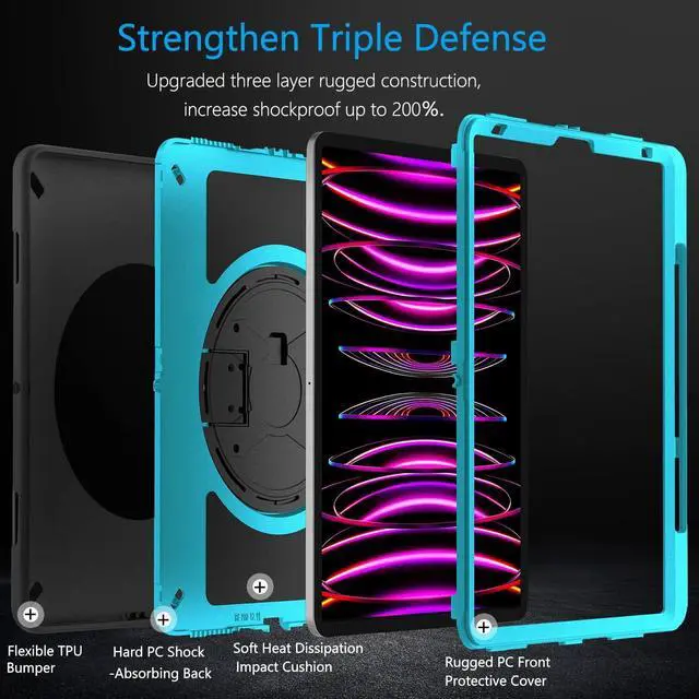 ENHANCED FULL-BODY PROTECTION &10-SHOCK: iPad 12.9 Pro Case exceed 2X Military Grade Drop Test Standard [MIL-STD 810G-516.6], Triple full-body heavy-duty protection provides up to 15ft drop protection, made of 2 durable PC and 1 flexible TPU bumper lasts 10× shock-resistant. Upgrade built-in sponge technology adds extra heat-dissipation.