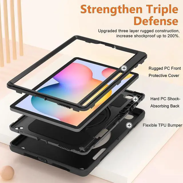 Military Triple Shockproof: Galaxy Tab S6 Lite Case is made of high-quality hard PC and flexible shock-absorbing TPU and exceeds 2X Military Grade Drop Test Standard [MIL-STD 810G-516.6]. Triple full-body heavy-duty protection provides up to 15ft drop protection against drops and impacts.