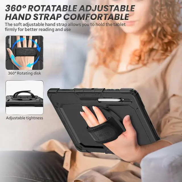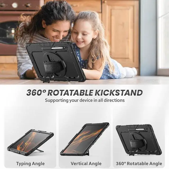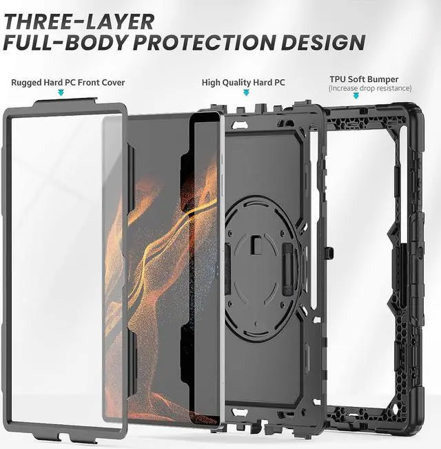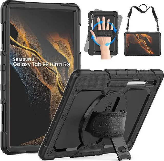 Full Body Protective Case for Samsung Galaxy Tab S8 Ultra 14.6 Inch, 3-Layer Rugged Military Grade Shockproof Case for Tab S8 Ultra with 360° Swivel Handle, S-Pen Holder, Shoulder Strap, Black