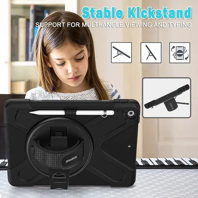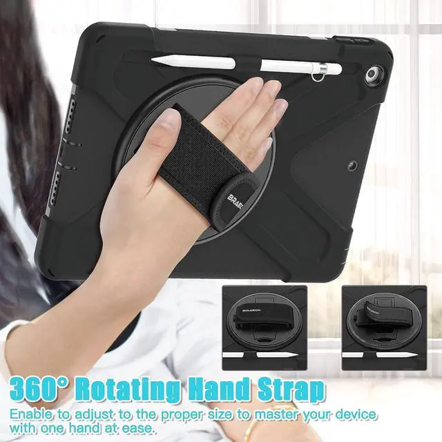 360° Swiveling Stand & Hand Strap Located on the back of apple iPad 9th/8th generation 10.2 Inch shockproof case 2021/2020, built-in 360 degree rotating kickstand and adjustable handle hand strap provides a more flexible and convenient way to use your tablet during work, study or journey, ideal for students,teachers,engineers,cashiers and waiters,etc.