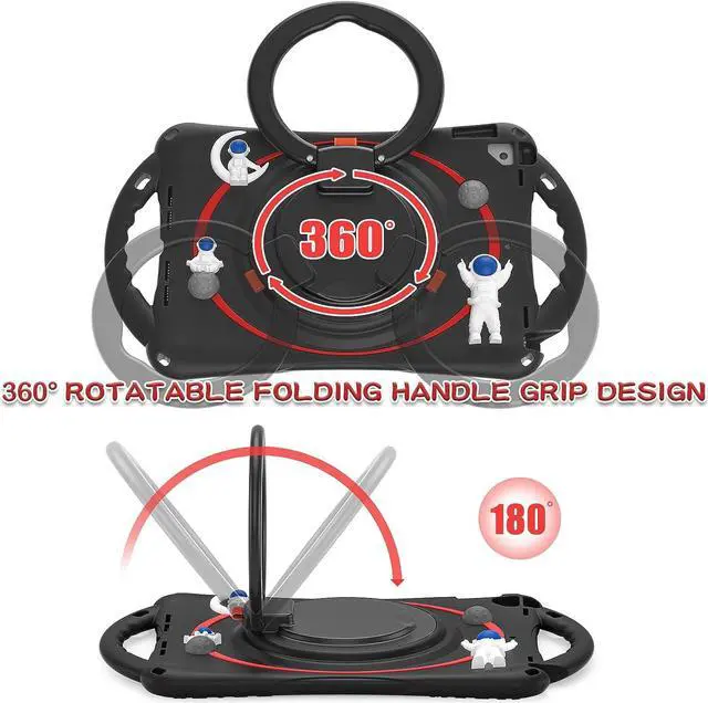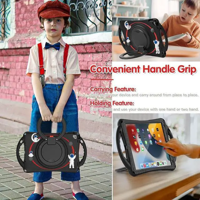 MULTI-FUNCTION HANDLE-KICKSTAND- The 360 Degree rotating Kickstand provides multi-angle viewing, offering a pretty convenient use experience for film watching, working and typing. The stand is stable enough on several different surface. Open as a comfortable handle for gripping and carrying.The handles on both sides allow children to hold the iPad easily and safely.