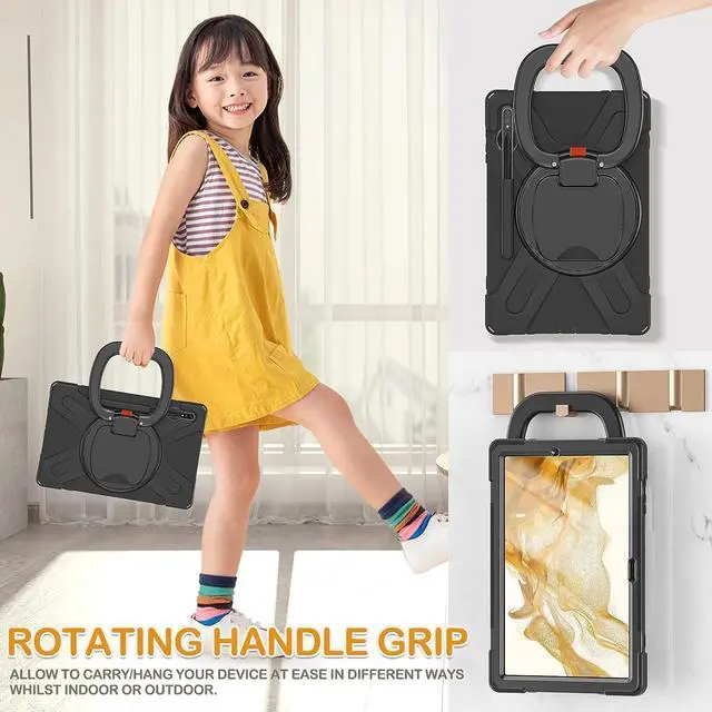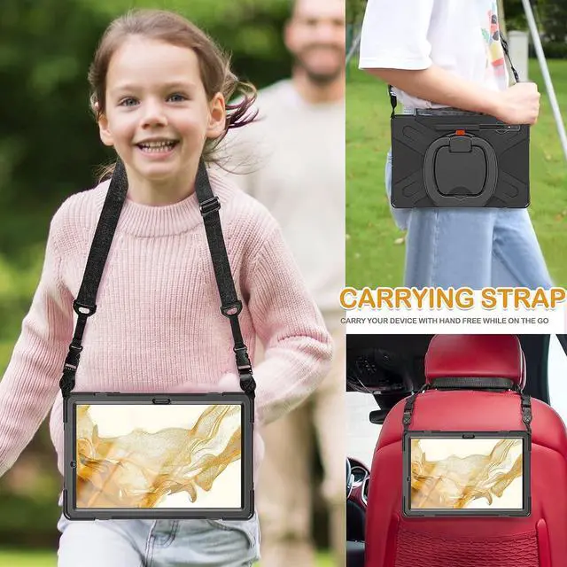 [Multi-Function Features] 360°rotating +180°folding grip can be used as a handle, easy to hang your Tablet in kitchen, washroom, bedroom; Kickstand is stable enough to stand on different surfaces for children to view. And with a adjustable shoulder strap, it is convenient for you to carry and hang everywhere.