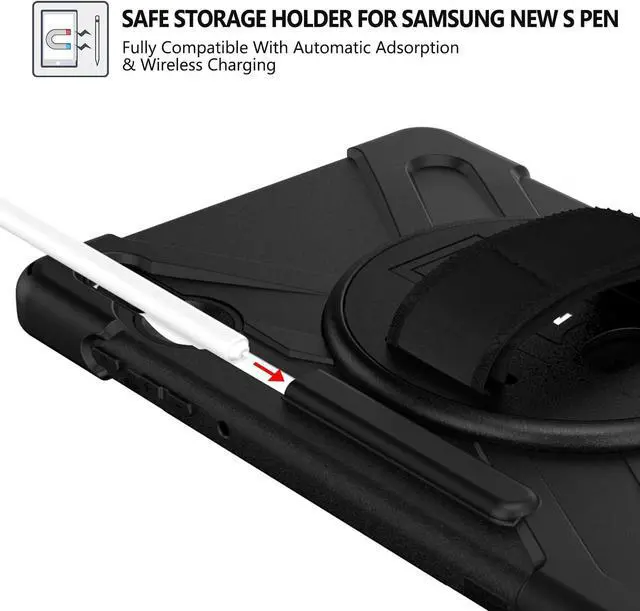 360 Degree Swivel Stand & Hand StrapLocated on the back of Galaxy Tab S6 heavy duty cases,built-in 360 degree rotating kickstand and adjustable handle hand strap provides a more flexible and convenient way to use your tablet during work, study or journey, ideal for students,teachers,engineers,cashiers and waiters,etc.