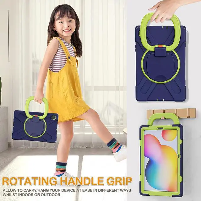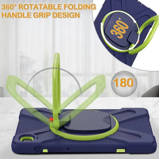 [Multi-Function Features] 360°rotating +180°folding Grip can be used as a handle, easy to hang your Tablet in kitchen, washroom, bedroom; Kickstand is stable enough to stand on different surfaces for children to view. And with a adjustable shoulder strap, it is convenient for you to carry and hang everywhere.