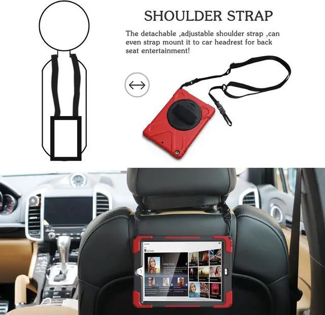 [Adjustable/Removable Shoulder Strap] Attach straps to any two holes to carry your device vertically or horizontally like a messenger bag/neck bag/sling/harness or holster; Allow you to display your iPad Air 1st Generation tablet behind one seat for personal viewing or between two seats for shared viewing.