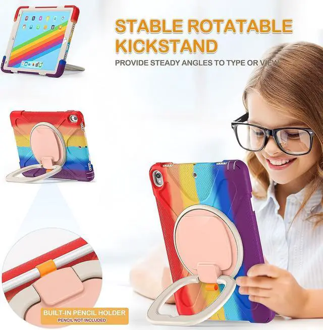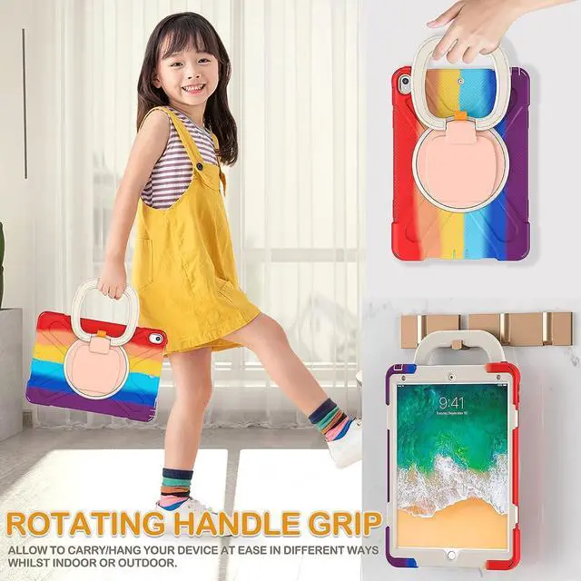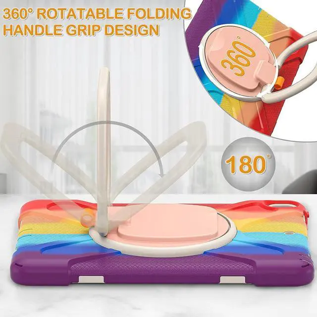Multi-Function Features: 360° rotating +180° folding Grip can be used as a handle, easy to hang your iPad in kitchen, washroom, bedroom; Kickstand is stable enough to stand on different surfaces for children to view. And with a adjustable shoulder strap, it is convenient for you to carry and hang everywhere.