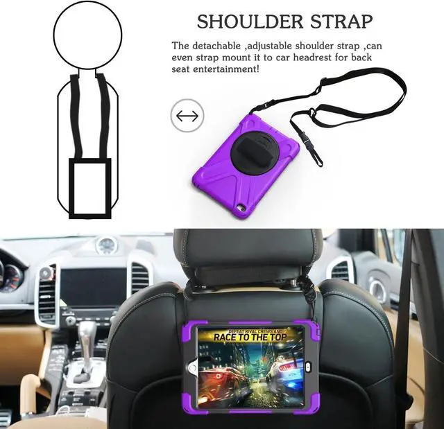 [Adjustable/Removable Shoulder Strap] Attach straps to any two holes to carry your device vertically or horizontally like a messenger bag/neck bag/sling/harness or holster; Allow you to display your iPad Mini5 & 4 behind one seat for personal viewing or between two seats for shared viewing.