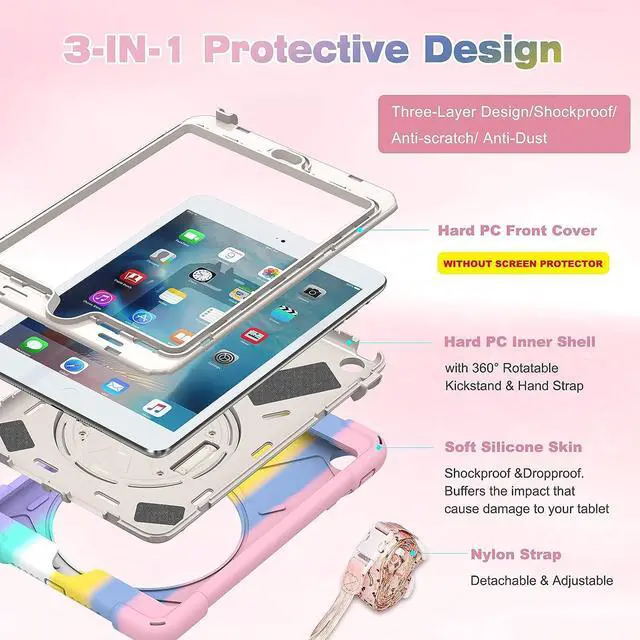 [Unique multifunction three layers] rugged protection design case with kickstand + a hand strap + a shoulder strap.not built-in-screen protector the tablet remains original touch feeling,but considering different consumers' needs we provide free screen protector of charge. It is an ordinary protective film, but if you wanna a greater effect you can apply the hard glass film.