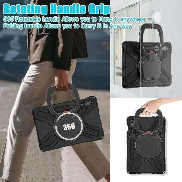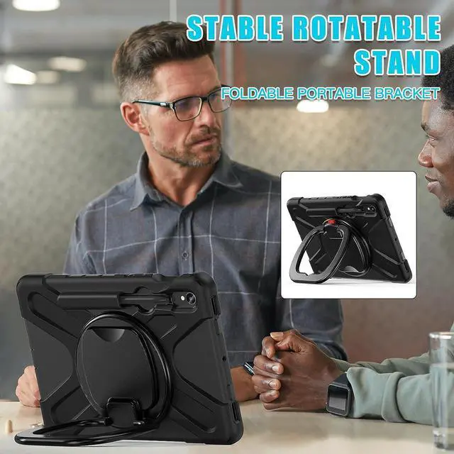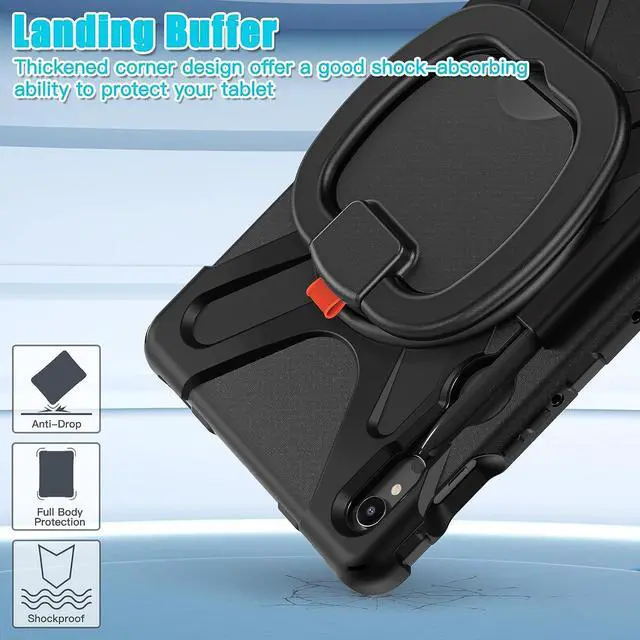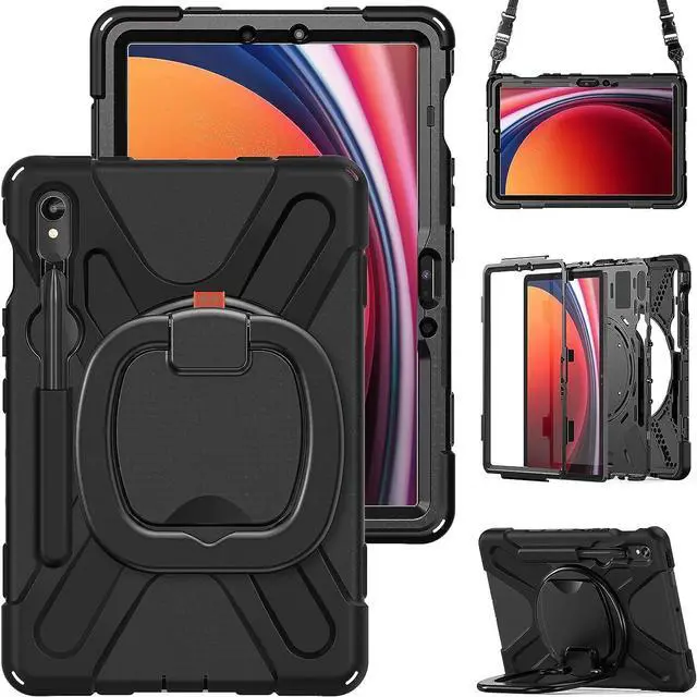 FUNCTIONALITY: 360°rotating +180°folding Grip can be used as a handle, easy to hang your Samsung galaxy tab S9 case in kitchen, washroom, bedroom; Kickstand is stable enough to stand on different surfaces for children to view. Button and port cover enable to prevent dust, it also support S Pen Charging.