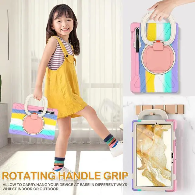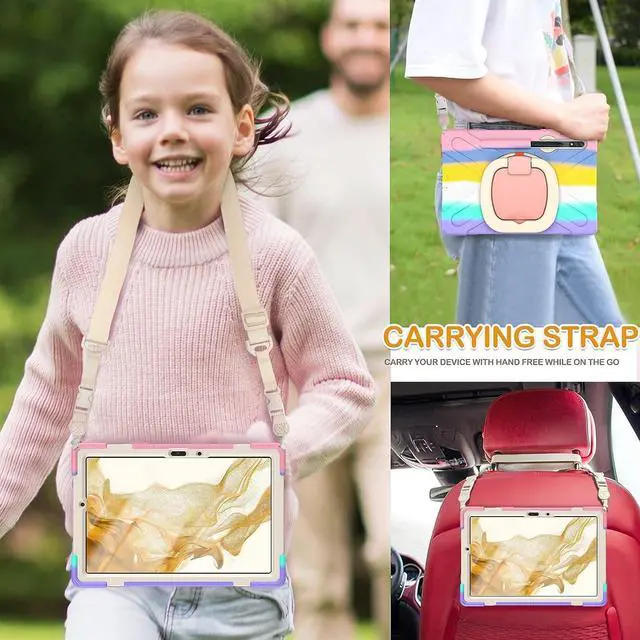 Multi-Function Features: 360°rotating +180°folding Grip can be used as a handle, easy to hang your Tablet in kitchen, washroom, bedroom; Kickstand is stable enough to stand on different surfaces for children to view. And with a adjustable shoulder strap, it is convenient for you to carry and hang everywhere.