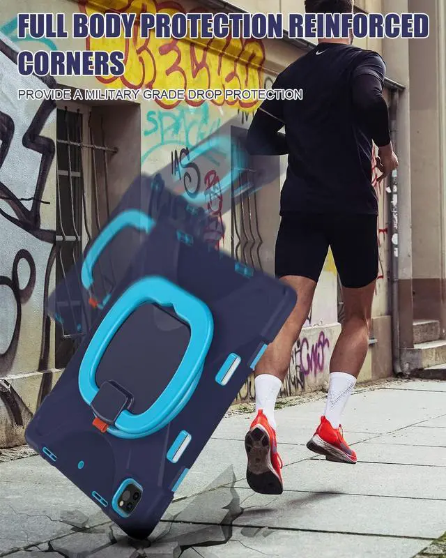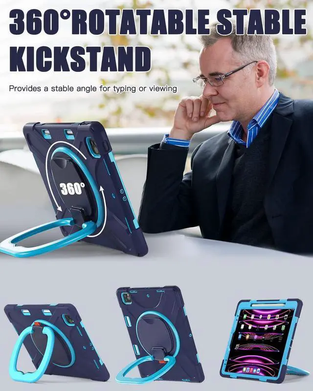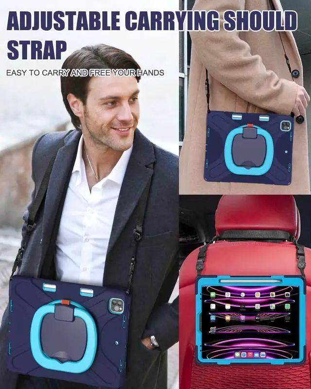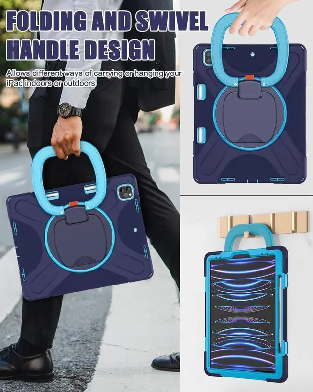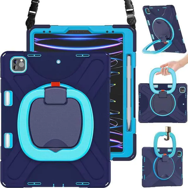 iPad Pro 12.9 Case 2022/2021/2020/2018: Heavy Duty Shockproof Cover for iPad Pro 12.9 Inch 6th/5th/4th/3rd Generation- Pencil Holder/Rotating Handle Grip/Stable Kickstand/Shoulder Strap, Navy