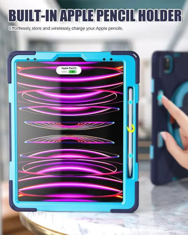 FUNCTIONALITY: 360°rotating +180°folding Grip can be used as a handle, easy to hang your iPad in kitchen, washroom, bedroom; Kickstand is stable enough to stand on different surfaces for children to view. Button and port cover enable to prevent dust, it also support Apple Pencil 2nd Gen Charging.