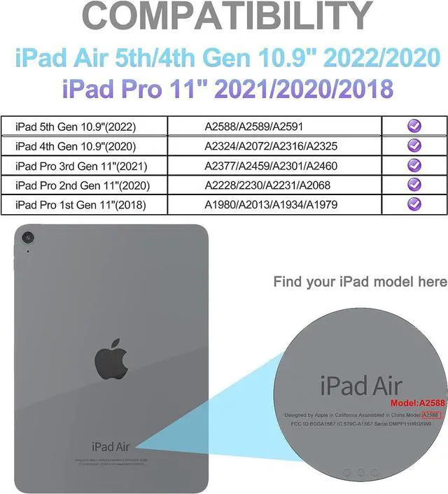 Compatibility: Specifically designed for New Apple iPad Pro 11 4th Generation 2022, Apple iPad Air 5th Generation Case 2022 (Model: A2589/A2591), Apple iPad Air 4th Generation Case 2020 (Model: A2324/A2072/A2316/A2325) and Apple iPad Pro 11 3rd/2nd/1st Case 2021/2020/2018 (Model: A1980/A2013/A1934/A1979/A2228/A2230/A2231), not fit any other model. PLEASE NOTE THE CASE WITHOUT BUILT-IN SCREEN PROTECTOR.