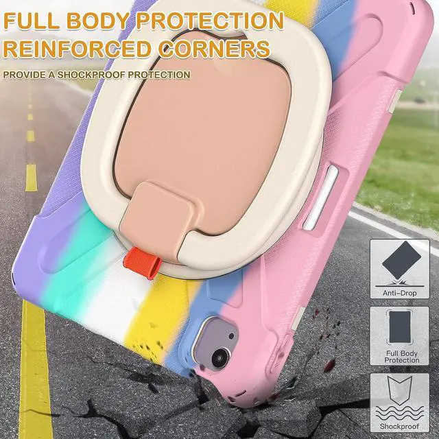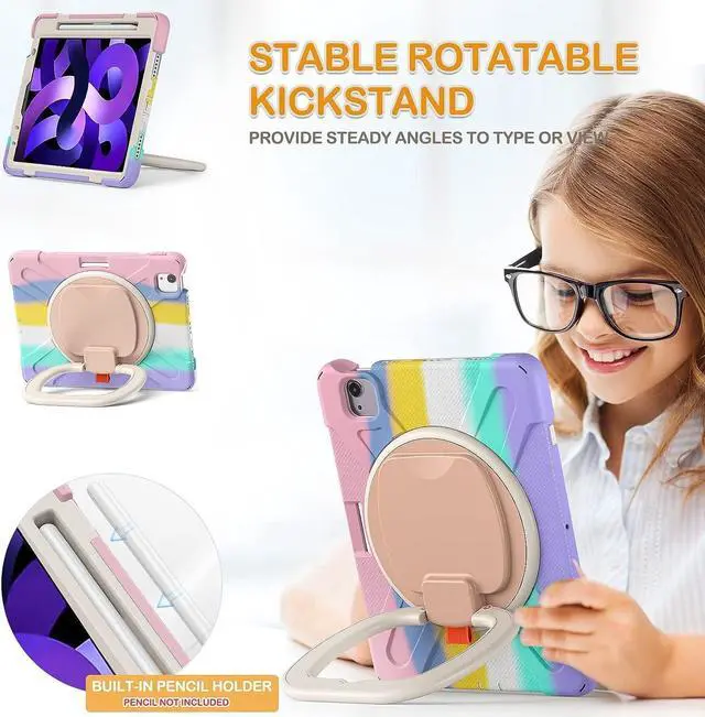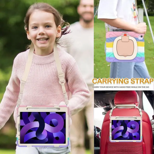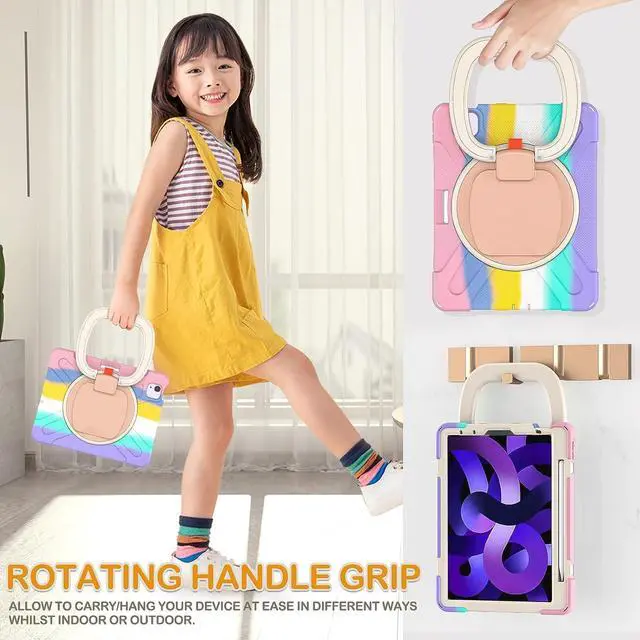 Multi-Function Features: 360°rotating +180°folding Grip can be used as a handle, easy to hang your iPad in kitchen, washroom, bedroom; Kickstand is stable enough to stand on different surfaces for children to view. And with a adjustable shoulder strap, it is convenient for you to carry and hang everywhere.