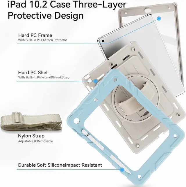 Detachable & Adjustable Shoulder StrapAttach the strap to any two corner holes of this iPad 10.2 Case.Carry your iPad conveniently wherever you are at home, at work,or on a trip.You can also hang it behind the headrest of the car seat for shared viewing.