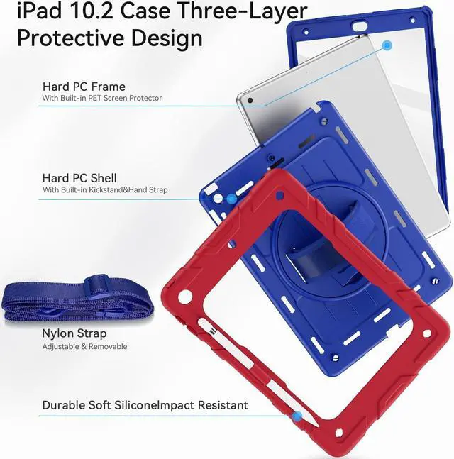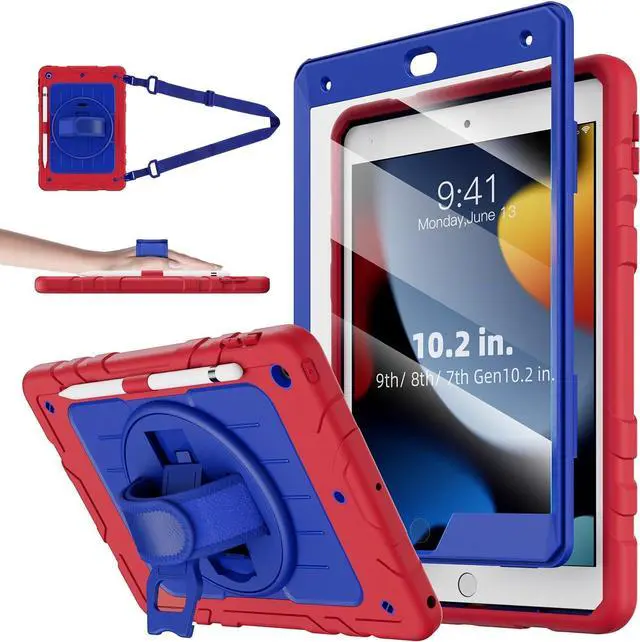 iPad 9th/8th/7th Generation Case-Built-in Screen Protector, Shockproof with Pencil Holder 360° Rotating Hand Strap&Kickstand, Shoulder Strap, for iPad 10.2 inch Case 2021/2020/2019(Red/Blue)