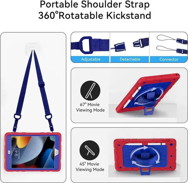 360°Rotating Kickstand & Hand StrapRotatable kickstand easily support your iPad in multi-angle viewing. Moreover,the soft hand strap allows you to hold your iPad firmly and comfortably to prevent accidental drops.And your kids can use iPad easily and safely to study or watch movies.