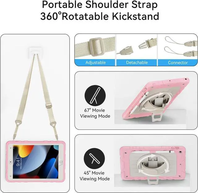 360°Rotating Kickstand & Hand StrapRotatable kickstand easily support your iPad in multi-angle viewing. Moreover,the soft hand strap allows you to hold your iPad firmly and comfortably to prevent accidental drops.And your kids can use iPad easily and safely to study or watch movies.