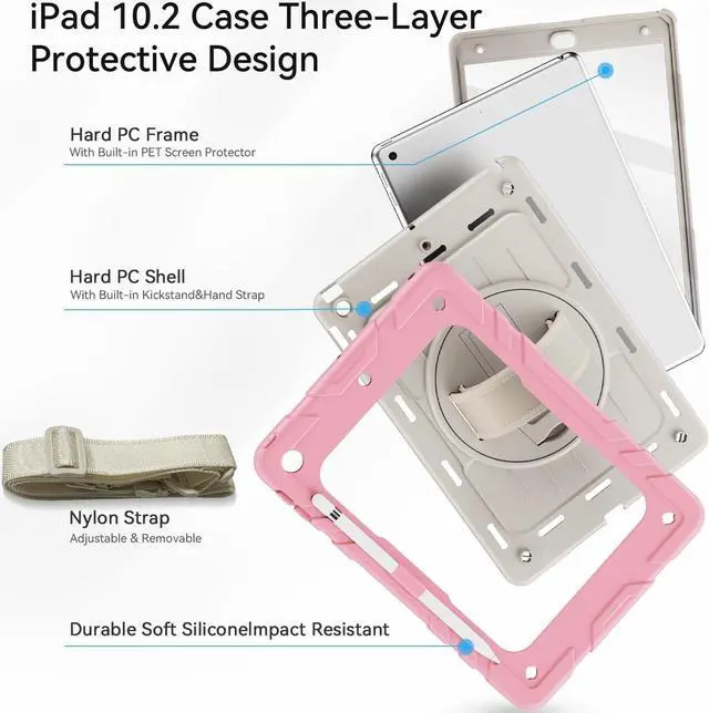 Detachable & Adjustable Shoulder StrapAttach the strap to any two corner holes of this iPad 10.2 Case.Carry your iPad conveniently wherever you are at home, at work,or on a trip.You can also hang it behind the headrest of the car seat for shared viewing.