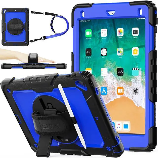 Pad 6th/5th Generation Case 9.7 with Screen Protector Pencil Holder [360 Rotating Hand Strap] &Stand, Drop-Proof Case for Pad 6th/5th/ Air 2/ Pro 9.7 (Blue+Black)