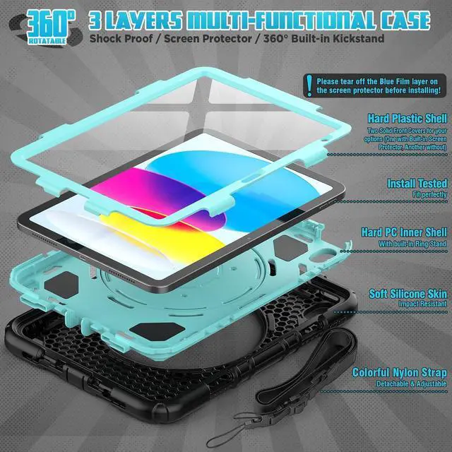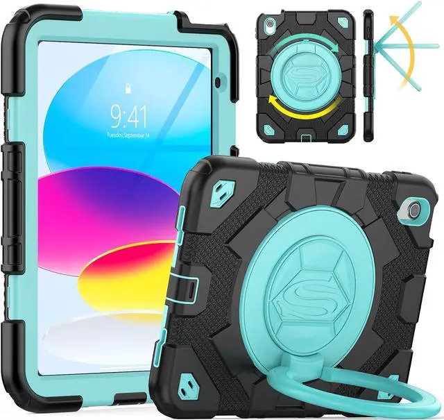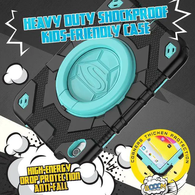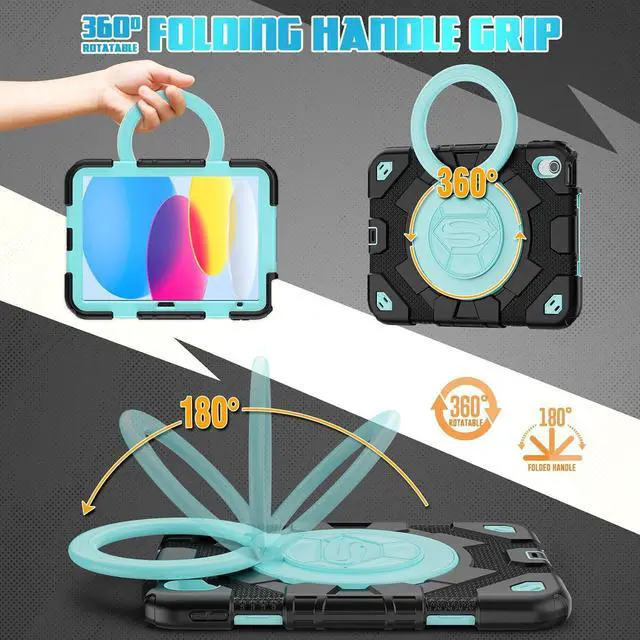 Rugged Rotating Kickstand- With built-in Kickstand allows landscape mode / portrait mode / typing mode achieved with its full angles Rotating Stand. You may also self customize the Pad 10th case to all angles, and hook anywhere.