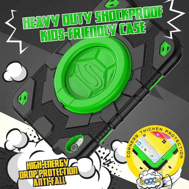 Rugged Rotating Kickstand- With built-in Kickstand allows landscape mode / portrait mode / typing mode achieved with its full angles Rotating Stand. You may also self customize the Pad 10th case to all angles, and hook anywhere.