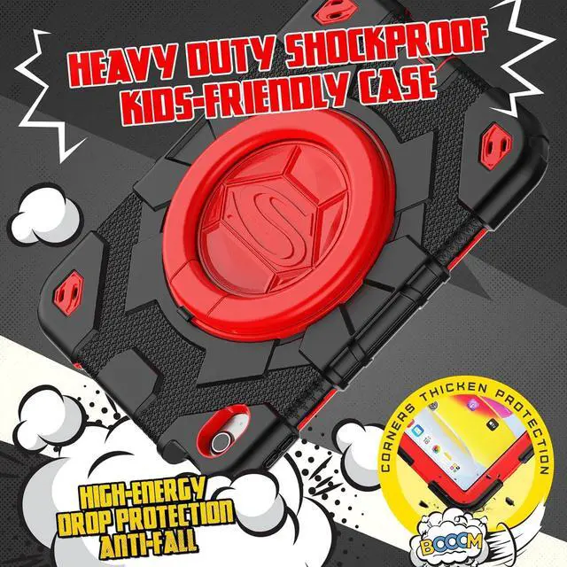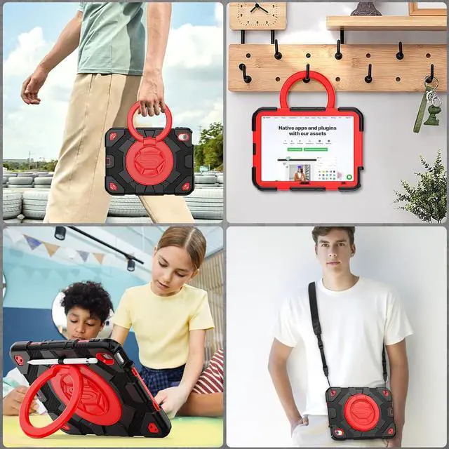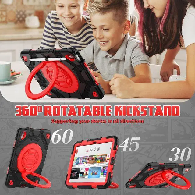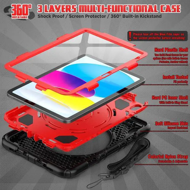 Pad 10th Generation Case 10.9'' with Screen Protector, 360° Rotating Handle Stand, Shoulder Strap & Pencil Holder, Heavy Duty Shockproof Case for Pad 10th Generation 2022 (Black+Red)