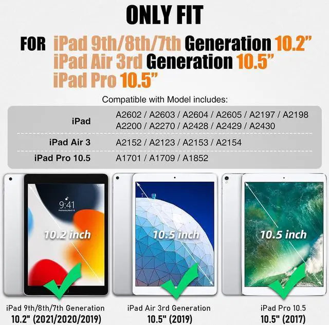 Compatibility: Exclusive designed for Pad 9th/8th/7th Generation 2021/2020/2019 10.2 inch (Model:Model: A2602 / A2603 / A2604 / A2605 / A2270 / A2428 / A2429 / A2430 / A2197 / A2200 / A2198). Not for other Pad series, please confirm the model of your Pad before purchase. (Please visit to choose the correct case for your Pad.)