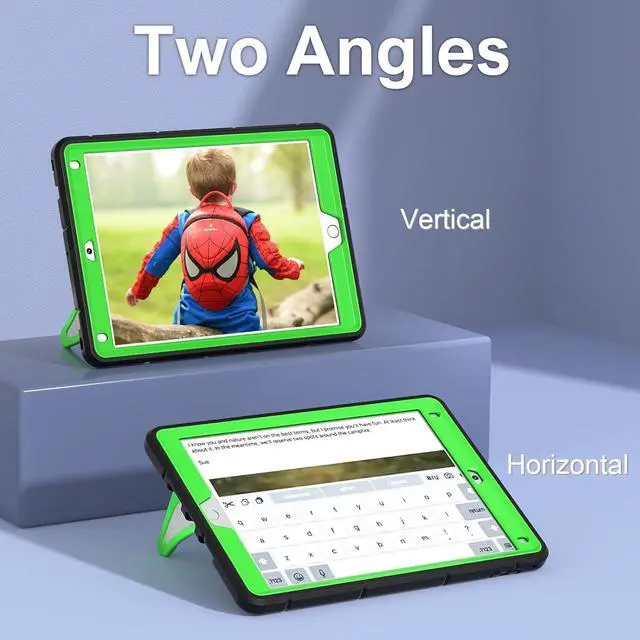 Functional Sturdy Kickstands Kids case for Pad 6th/5th generation built-in double strurdy kickstands, extremely sturdy when using (watching and typing) . Double kickstands design is more sturdy and durable than one kickstand