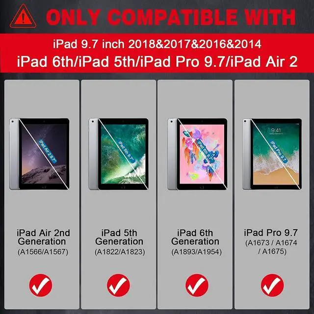 • Compatible ModelsAuizotl case compatible with Pad 6th/5th Generation 2018&2017(A1893/A1954/A1822/A1823) & Pad Pro 9.7 (A1673 / A1674 / A1675) & Pad Air 2 2014(A1566/A1567), Please go to "Setting"> "General"> "About"> "Model Number", click on the model number, then you will see the model number NOTE: This Pad 9.7 case WITHOUT built-in screen protector