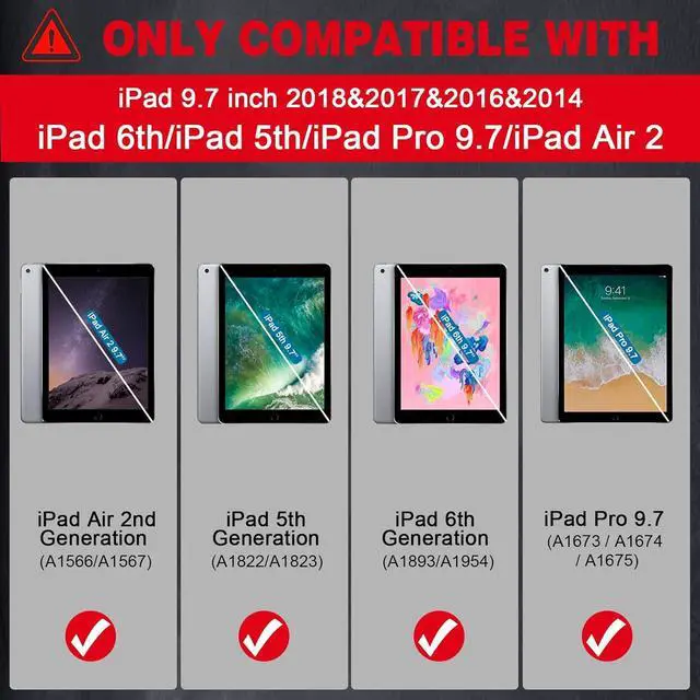• Compatible ModelsAuizotl case compatible with Pad 6th/5th Generation 2018&2017(A1893/A1954/A1822/A1823) & Pad Pro 9.7 (A1673 / A1674 / A1675) & Pad Air 2 2014(A1566/A1567), Please go to "Setting"> "General"> "About"> "Model Number", click on the model number, then you will see the model number NOTE: This Pad 9.7 case WITHOUT built-in screen protector