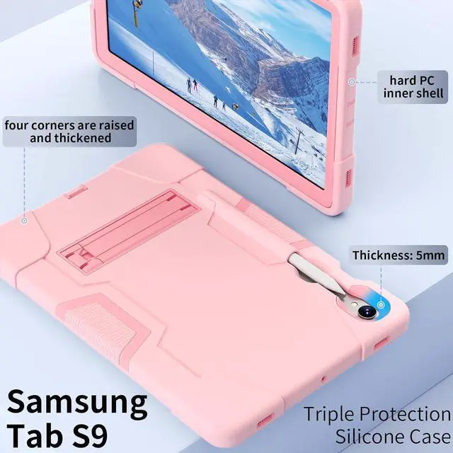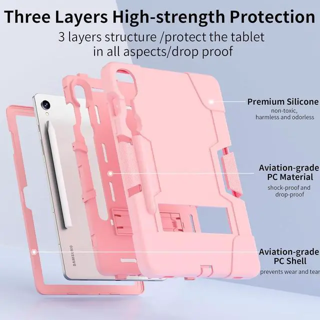 Military Grade Drop ProtectionIt made of durable Hard PC+Silicone, 3-layer Full Body protection structure,provide a perfect protection,protects your Galaxy Tab S9/S9 FE from scratches and accidental drops,bumps,and impacts