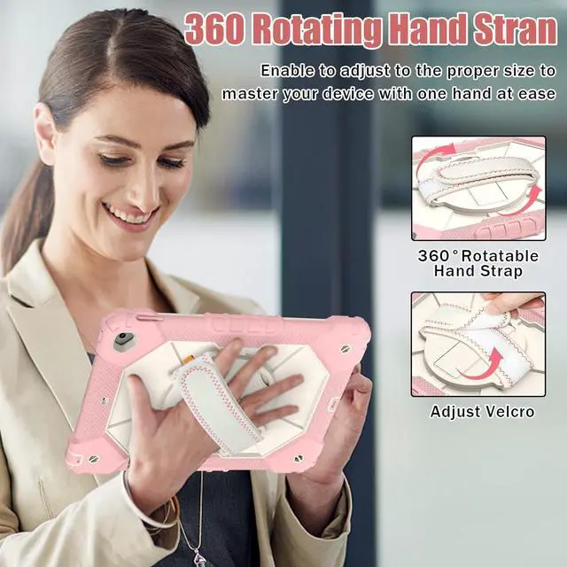 360° Rotatable Stand & Hand Strap360° Rotatable foldable kickstand offers multiple angles for enjoying the comfortable keyboard-typing and movie-viewing. The 360°Rotatable adjustable hand strap allows for easy holding .