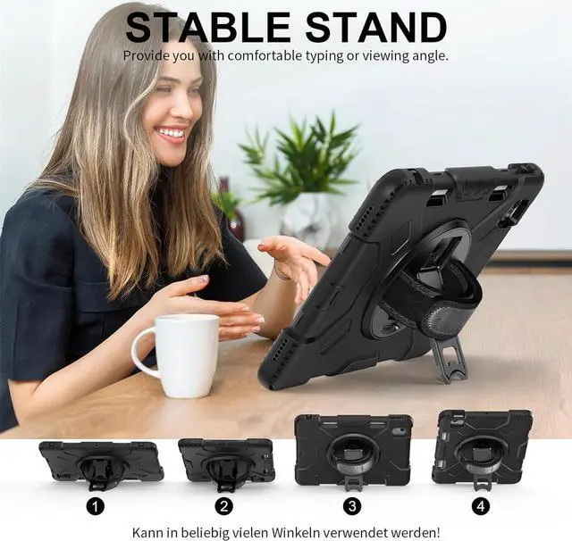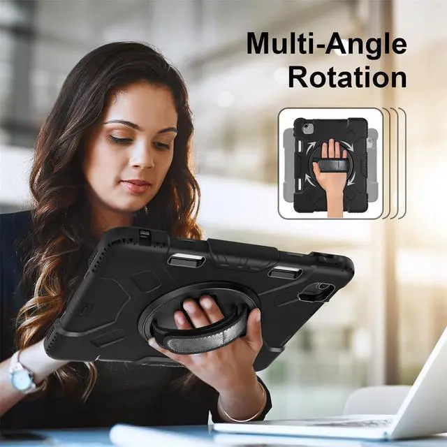 360° Rotating Stand + Adjustable Wrist StrapThe case includes a 360º rotating stand that lets you find the perfect viewing angle for typing, reading, or watching. The hand strap provides a secure grip on your device while on the go.