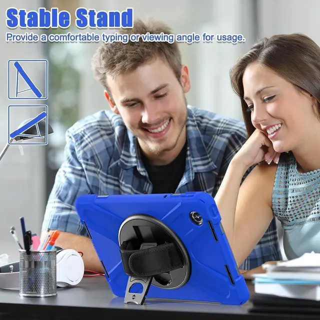 360° Rotating Stand + Adjustable Wrist StrapThe case includes a 360º rotating stand that lets you find the perfect viewing angle for typing, reading, or watching. The hand strap provides a secure grip on your device while on the go.