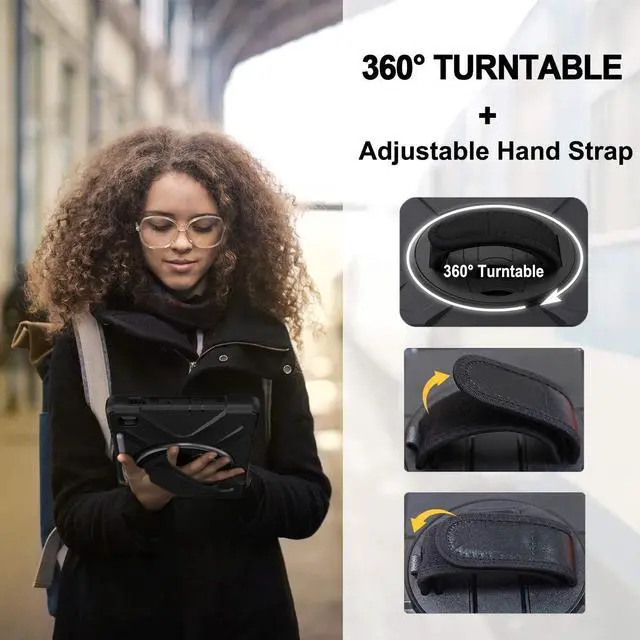 360 Turntable & Kicktand DesignThe hard rugged case with 360 degrees swivel turntable supports your tablet from multiple angles.On the back side of the high impact resistant Tab S6 Lite 10.4 inch case,there is a sturdy foldable bulit-in kickstand.Convenient for attending conference, watching videos and typing.