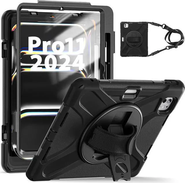for iPad Pro 11 Inch Case M4 2024 with Screen Protector, iPad Pro 11 Case 5th Generation with Pencil Holder, Full Body Protection Shockproof Case with 360° Rotating Stand+Hand Strap, Black