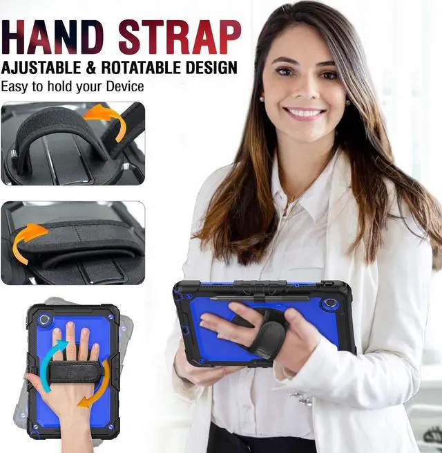 Built-in 360 Rotatable Kickstand and Hand Strap : 360-degree rotating swivel stand supports position of 3 angles(Vertical, Horizontal, and Halfway between), ideal for watching videos, conferences and travelling. Soft rotating handle strap prevents falling of galaxy s6 lite tablet, featuring convenient use for teachers, students, waiters, doctors, nurses and conference presenters.