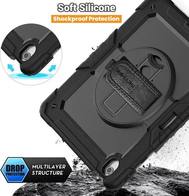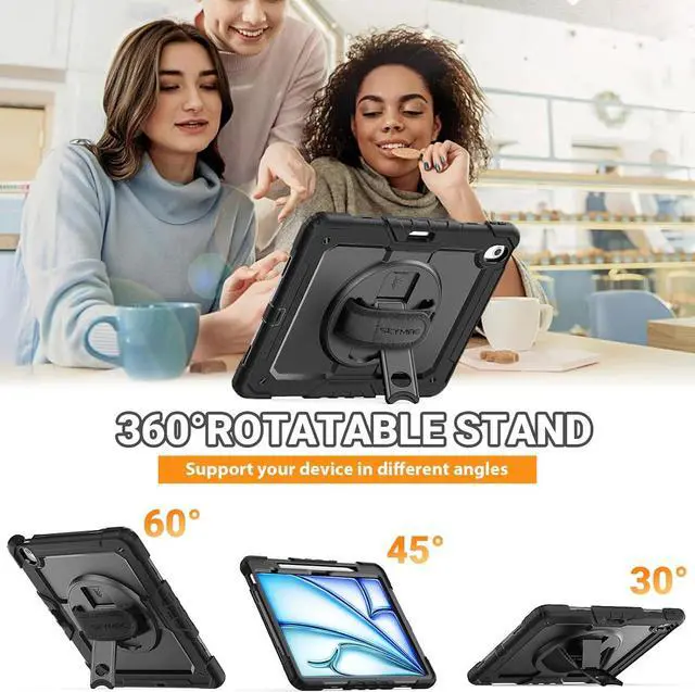 Built-in 360 Rotatable Kickstand and Hand Strap : 360-degree rotating swivel stand supports position of 3 angles(Vertical, Horizontal, and Halfway between), ideal for watching videos, conferences and travelling. Soft rotating handle strap prevents falling of iPad Air 13 tablet, featuring convenient use for teachers, students, waiters, doctors, nurses and conference presenters.