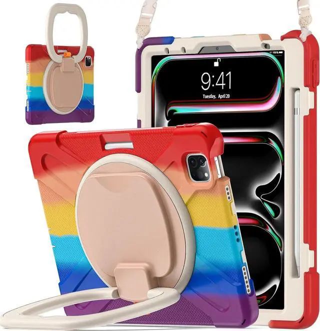 for iPad Pro 11-inch Case (2024) M4 Chip Model A2836 Heavy Duty Rugged Durability Silicone Tablet Cover with 360° Rotating Ring Foldable Kickstand & Shoulder Strap, Colorful Pink