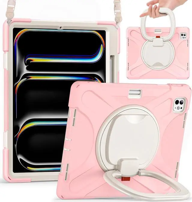 for iPad Pro 13-inch Case (2024) M4 Chip Model A2925 Heavy Duty Rugged Durability Silicone Tablet Cover with 360° Rotating Ring Foldable Kickstand & Shoulder Strap, Pink