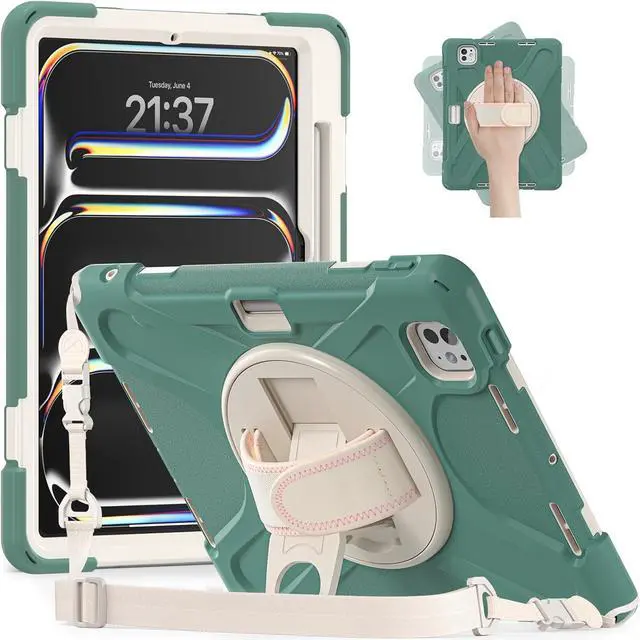 Case for iPad Pro 11-inch (2024) M4 Chip Model A2836 Heavy Duty Rugged Durability Silicone Tablet Cover with 360° Rotating Hand Strap Foldable Hidden Stand & Shoulder Strap, Sea Green