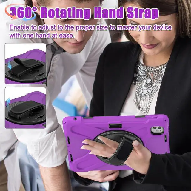 Case for iPad Pro 11-inch (2024) M4 Chip Model A2836/A2837 Heavy Duty Rugged Durability Silicone Tablet Cover with 360° Rotating Hand Strap Foldable Hidden Stand & Shoulder Strap, Purple